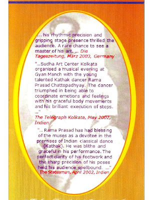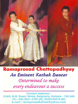 Nothing succeeds like success- is perhaps the best phrase to illustrate his long journey. Aspiring to reach newer heights has always remained the key factor for him. Rama Prosad Chattopadhyay started his dance career under the guidanceSmt. Sushmita Mishra, wife of Pt. Ramgopal Mishra of Jaipur Gharana. He later studied under the guidance of Pd. Vijai Shankar and Padma Vibhushan Pt. Birju Mahara & Shrimati Saraswati Sen. He was awarded a National Scholarship in the year 1988-89 under the guidance of Pt. Birju Maharaj, New Delhi from H.R.D. Corporation Govt. of lndia. Presently he is dancing in Maharajji's group choreographies. Rama Prosad Chattopadhya qualified in Kathak dance and is holding a MA in dance, Nritya Bhaskar from Pracheen Kala Kendra, Chandigarh (he stood first and was awarded a Gold Medal) and Nritya Prabhakar from Prayag SangeeSt amiti A llahabad. He stood first in All India Dance Competition organized by Prayag Sangeet Samiti, Allahabadand awarded a Gold Medal, and in 1988 Singer Moni by Sur Singer Samsad Bombay. He is general artist of Kolkata Doordarshan Kendra.In 1998, he founded his own Kathak Institition, the Sudha Art Center in Kolkata.