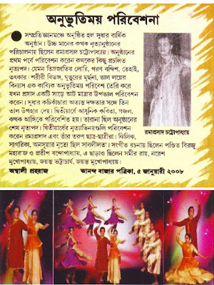 Rama Prosad Chattopadhyay has performed to enthralled audiences all over India as well as in Germany, ltaly and Bangladesh, Austria. Participated in many prestigious Festivals like Kalka Bindadin Mahotsav (New Delhi), Basant Utsab (New Delhi), Lakshman Mela (Lucknow), Asiad 82 atNew Delhi and West Bengal (New Delhi), Uday Shankar Festival inauguratebdy Prime Minister Mrs. Indira Gandhi in the year 1983 (New Delhi), Konarak Festival (Konarak)